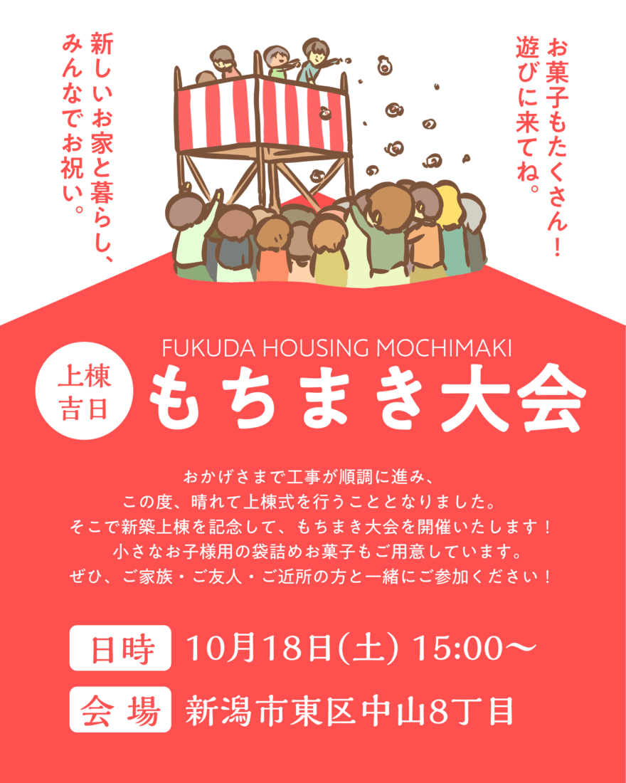 おかげさまで工事が順調に進み、この度、晴れて上棟式を行うこととなりました。そこで新築上棟を記念して、もちまき大会を開催いたします!小さなお子様用の袋詰めお菓子もご用意しています。