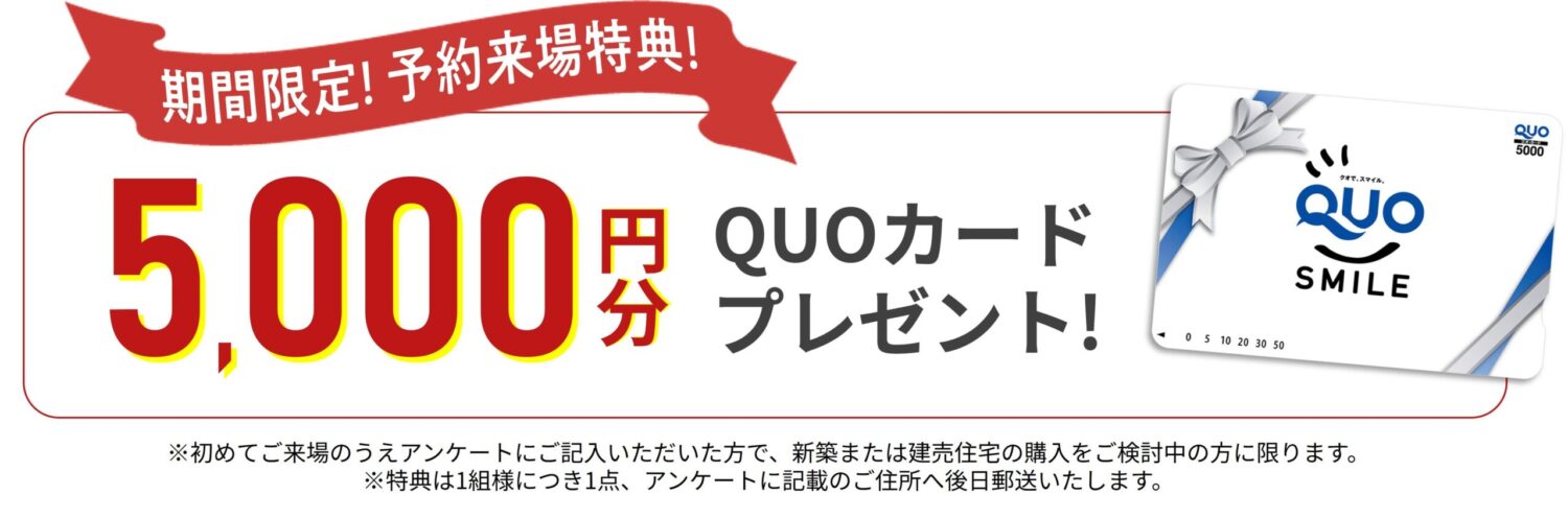 WEBからのご来場予約で、5,000円分のQUOカードをプレゼントいたします。予約フォームよりご予約ください。