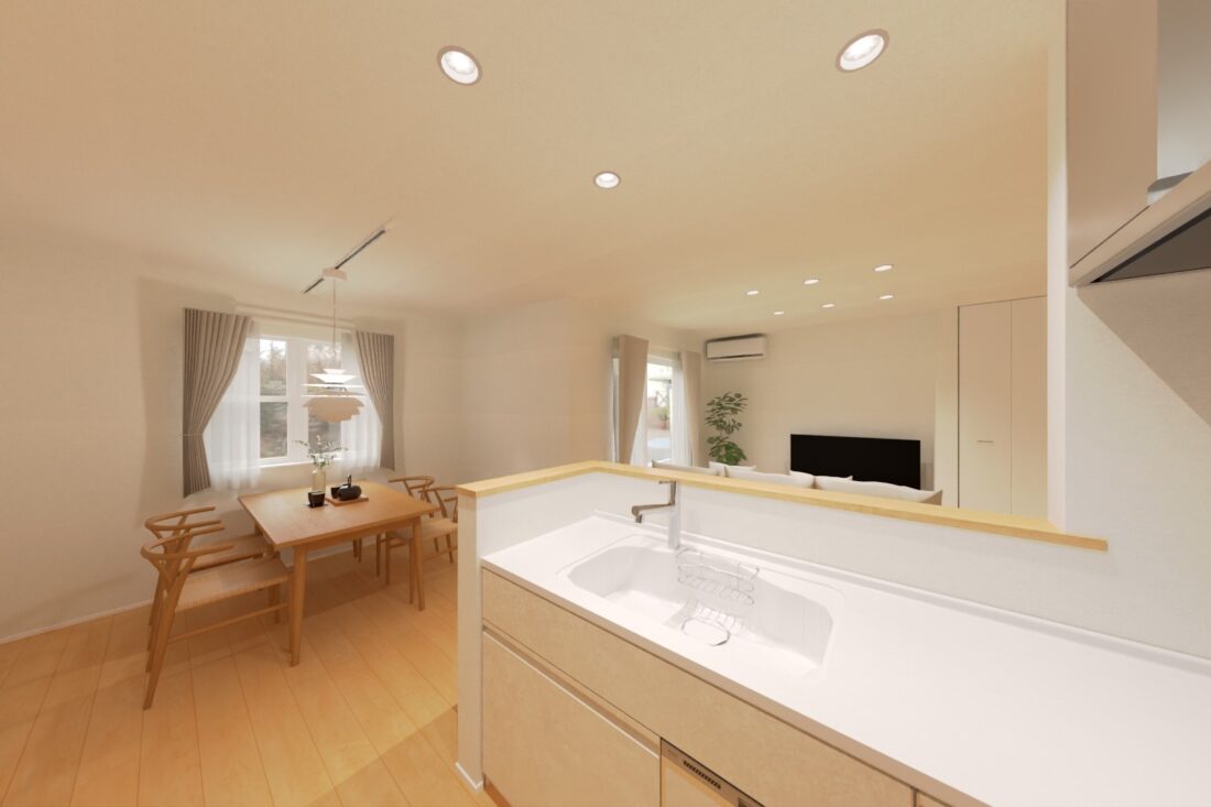 ●システムキッチンは、人工大理石のシンクに食器洗浄乾燥機付き。便利なカップボード付き。