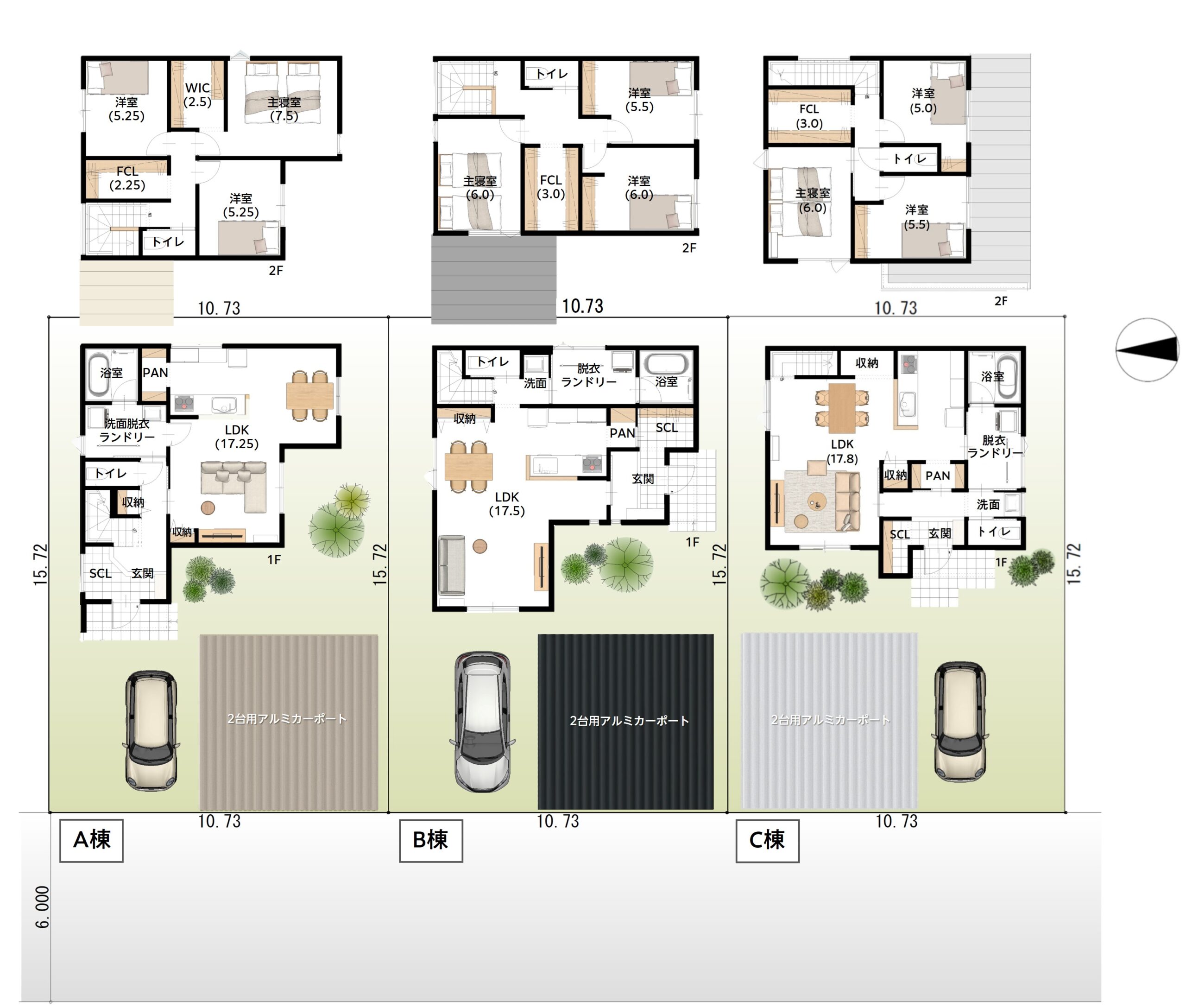 敷地面積 【A棟】168.66㎡(51.02坪)【B棟】168.64㎡(51.01坪)【C棟】168.66㎡(51.02坪)