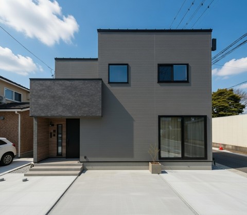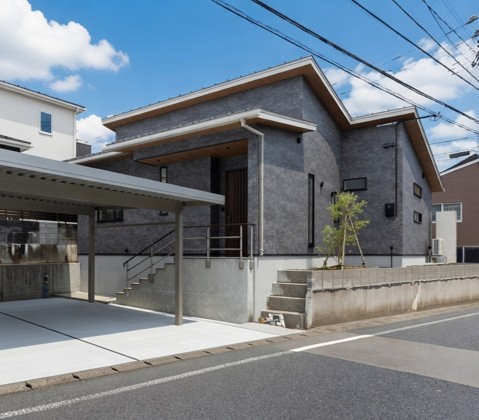 2面道路の分譲地角地に建つ邸宅。敷地を最大限に活かし、駐車スペースやリビングの配置をプランニング。メンテナンスのしやすさを考慮し、耐久性が高...