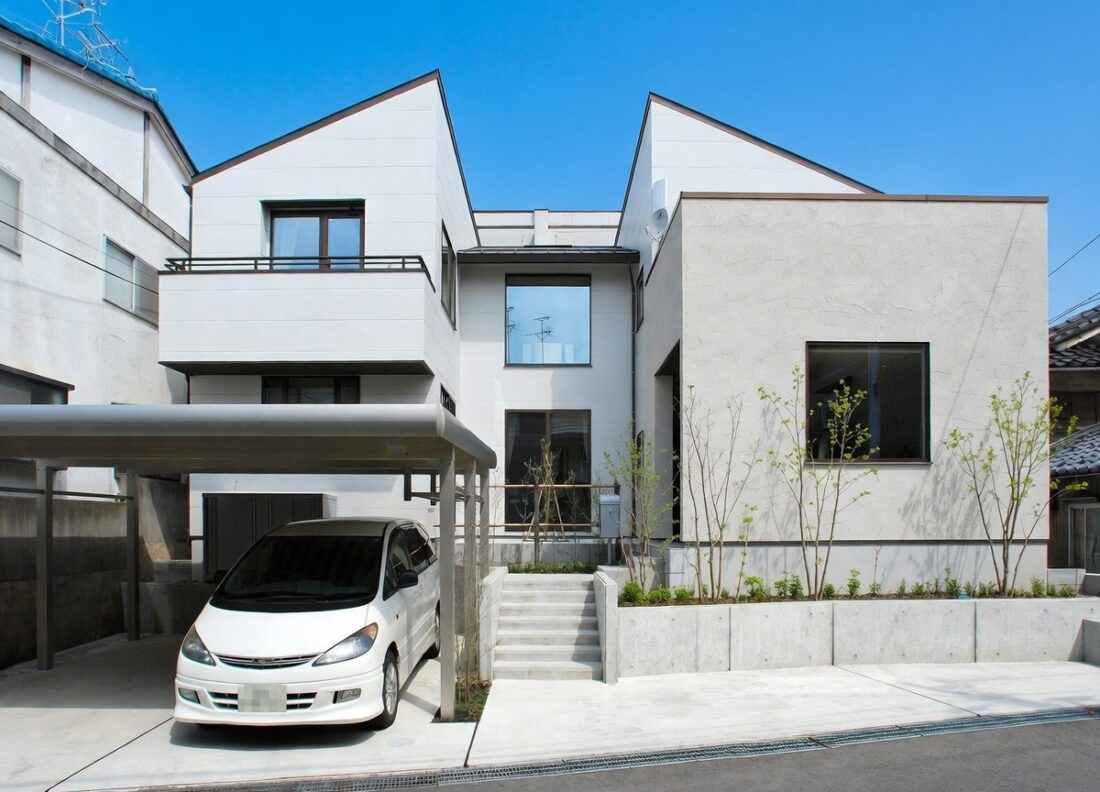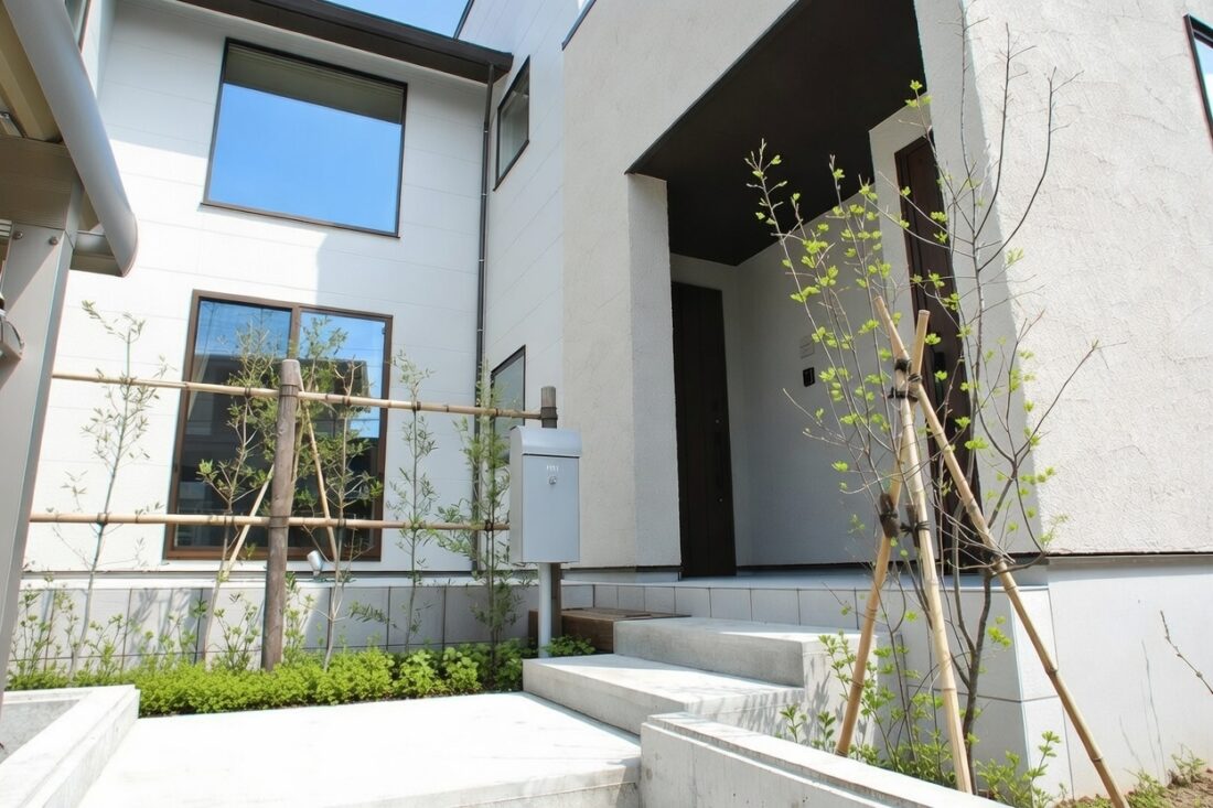 外装は、塗り壁が施され、デザイン性の高い目を惹く外観です。中庭の景観を望む大きな吹抜けのあるホールにはグランドピアノを備えてあります。オリーブのシンボルツリーは家のどこからでも見ることができて、住む人の癒しになっています。キッチンの後ろは、収納や冷蔵庫を扉で隠せるため、生活感を出さずにスッキリした空間を保つことができます。