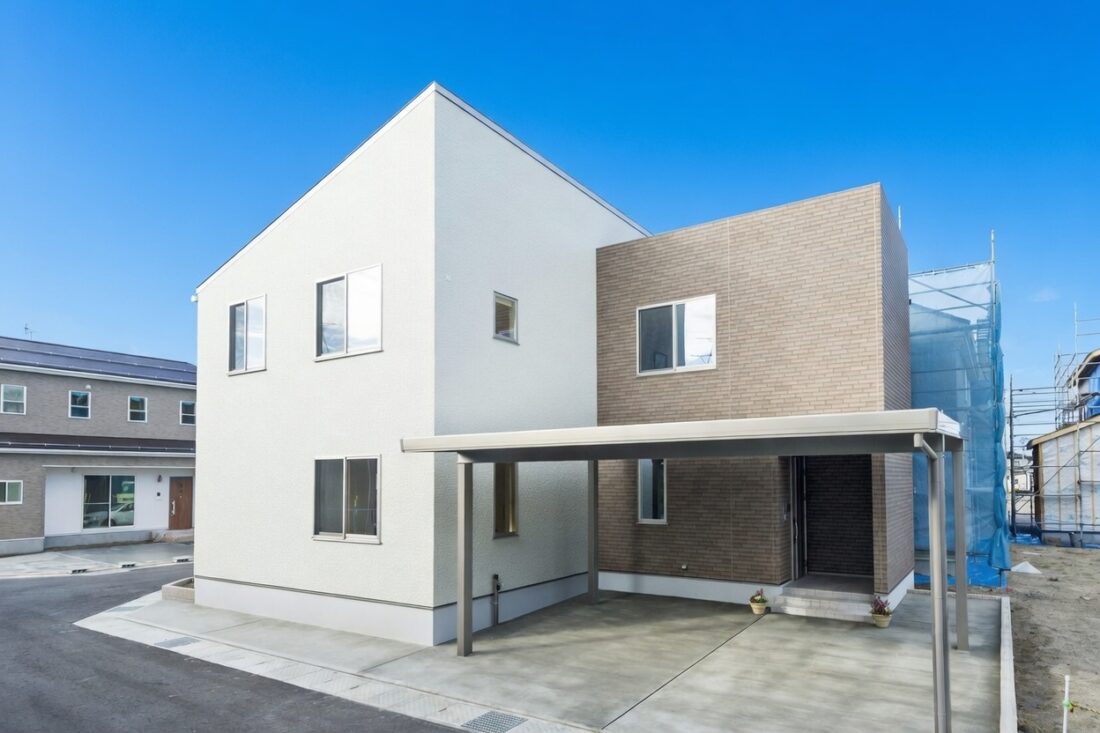 白をベースに、ライトブラウンの外壁材を採用したシンプルな外観デザイン。家族がいつも過ごすリビングダイニングは、日中を通して明るいです。テレビ裏の壁面には、空間にマッチした柔らかいカラーのタイルをアクセント施しました。大きめのシュークロークや使い勝手の良い場所へ収納を配置し、暮らし易く、過ごし易い住まいとなっています。