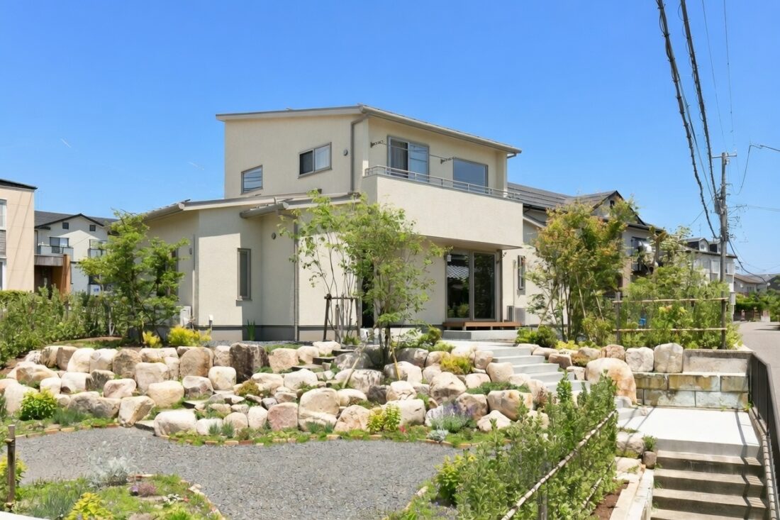 築30年超の住まいを建て替えました。広い敷地の中に緑を豊富に植え、庭の斜面は石積みに。