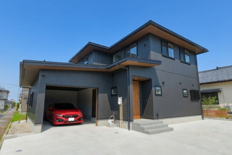 愛車を守るインナーガレージを備えた、ブラックの金属サイディングがかっこいい外観デザイン。軒下とガレージのシャッター、玄関ドアの色味を統一しました。インナーガレージは、車好きな施主様が車いじりをしたり、パーツを置いたりできるよう広いつくりになっています。