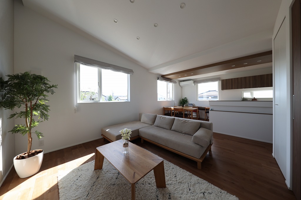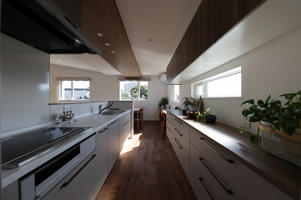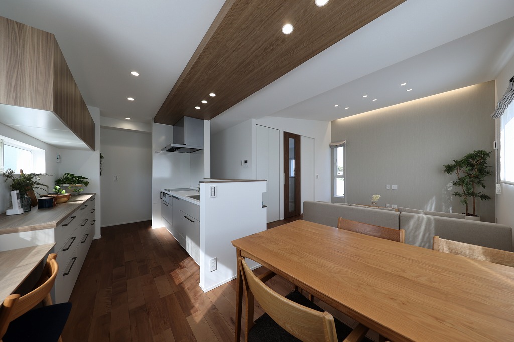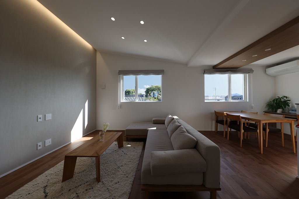 2階にLDKを設けることで、プライバシーを確保しながら抜け感ある眺望と自然光に恵まれたリビング空間、 水まわりの効率的な動線が実現しました。