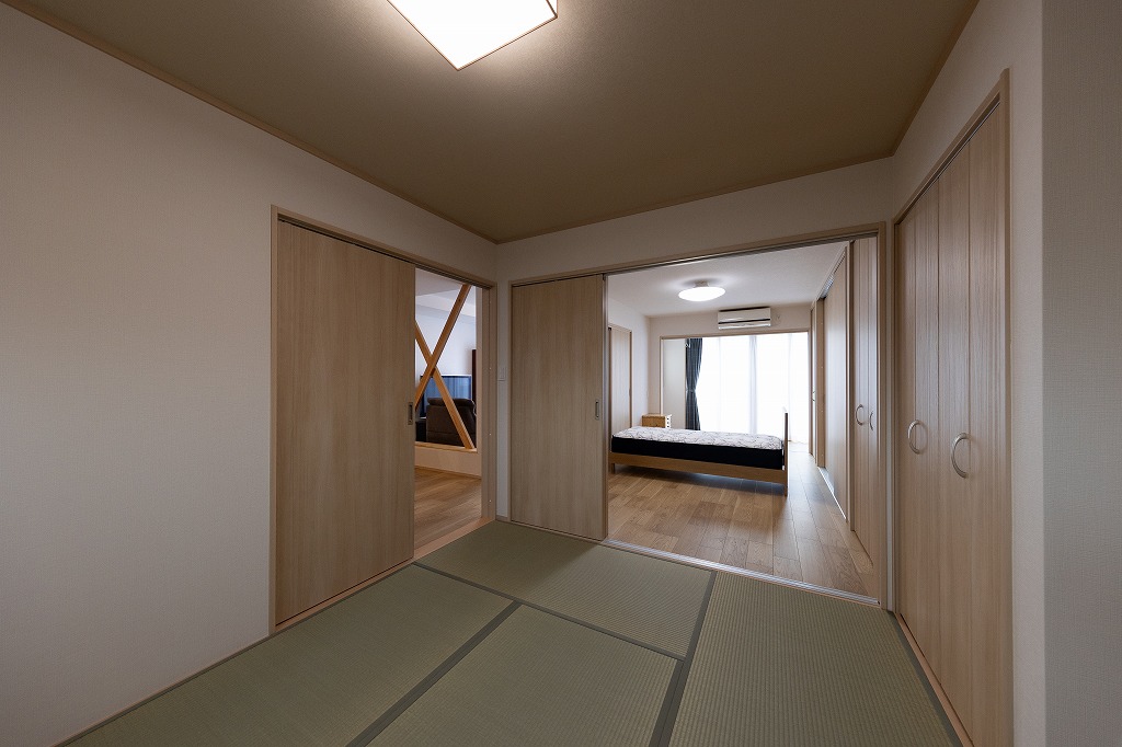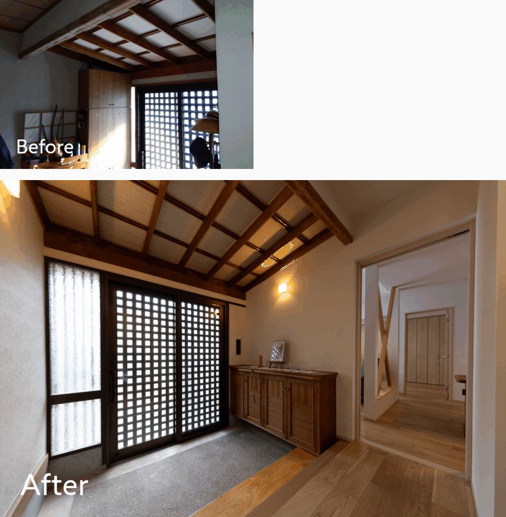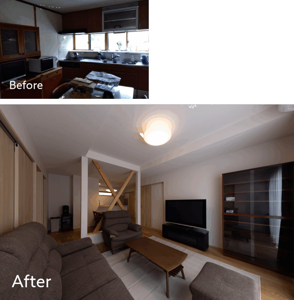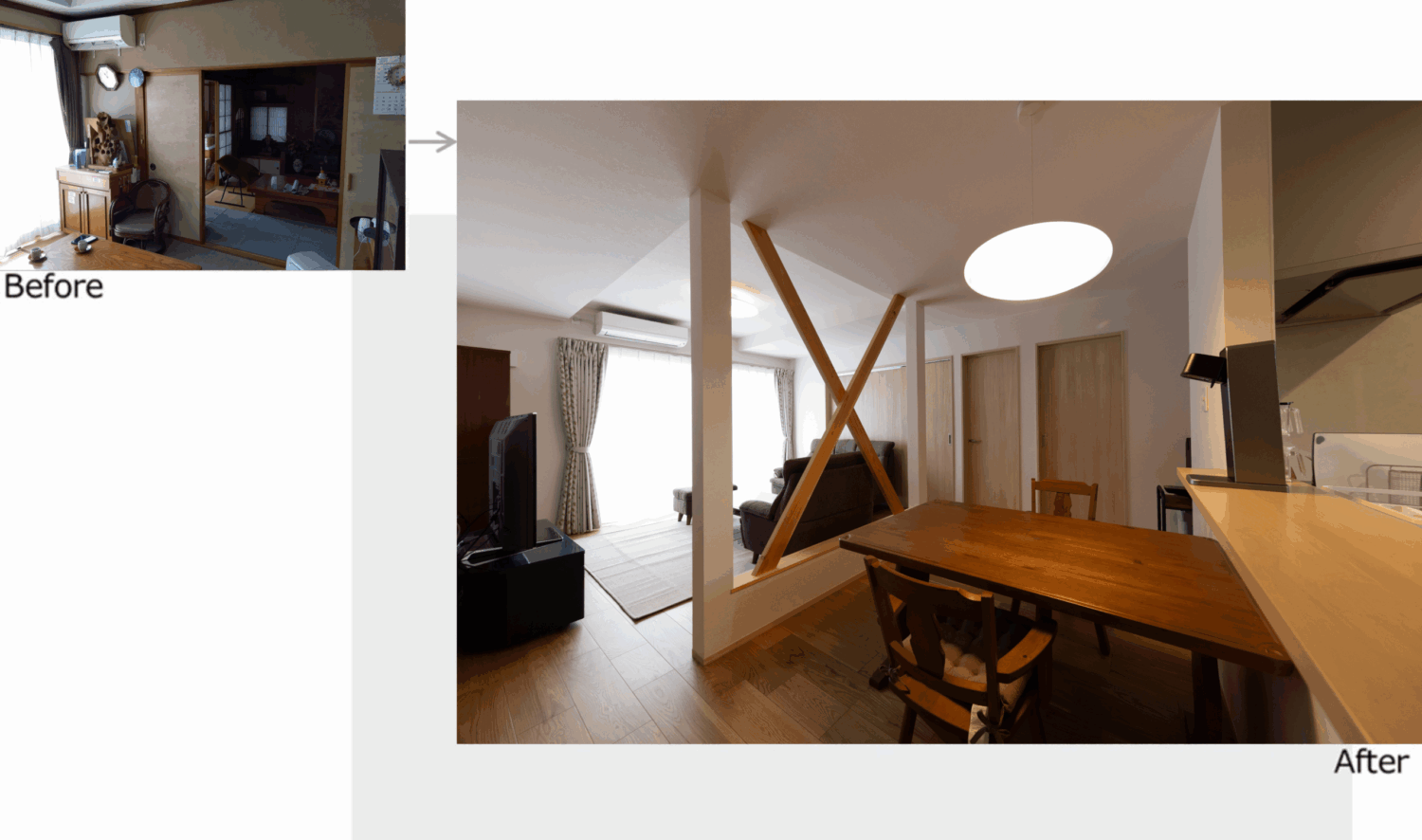 旦那様はこの家そのものに強い愛着と信頼を持ち、「むやみに柱を抜きたくない」との想いを大切にされていました。その考えを尊重し、構造の良さを活かしながら〝使えるものは残す〞という姿勢でプランを検討。まっさらな新築のように一新するのではなく、家の記憶を受け継ぎながら快適さを加えたリノベーションとなりました。