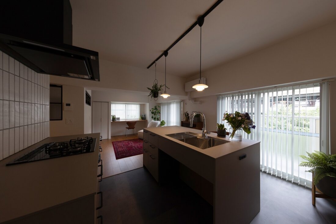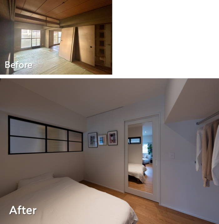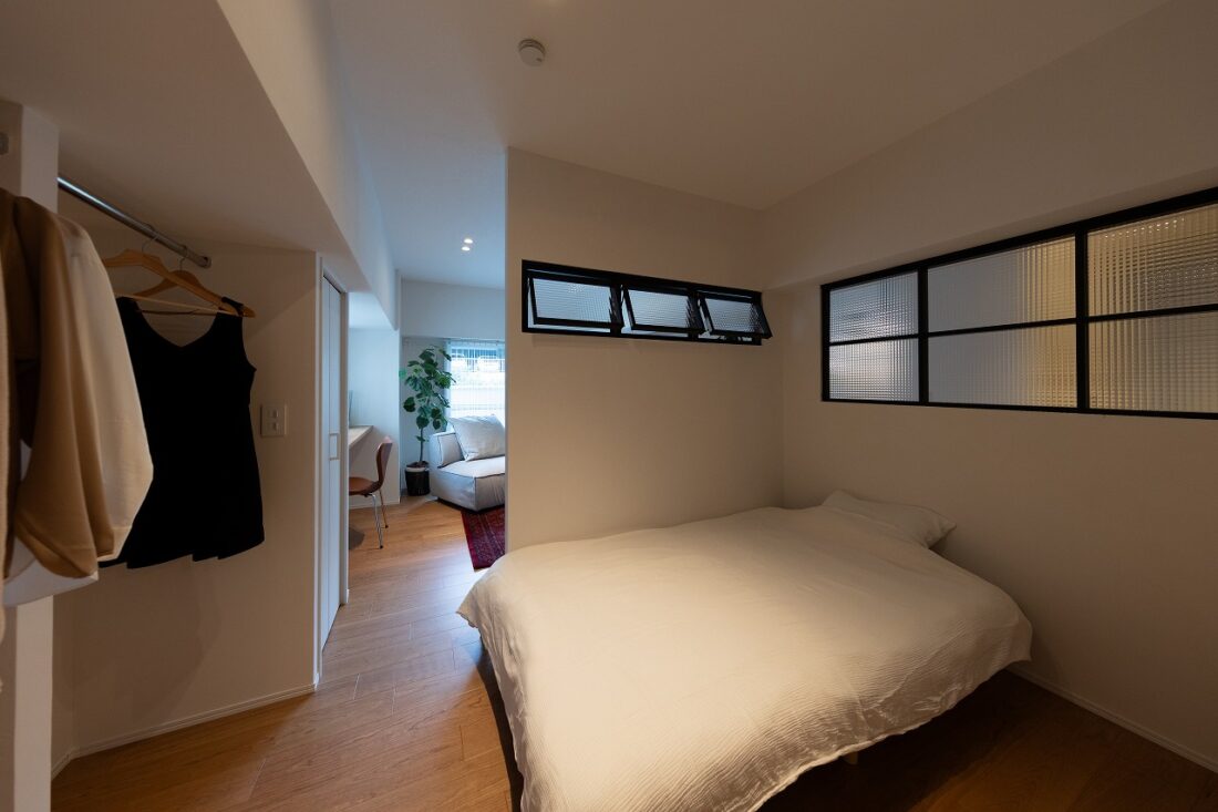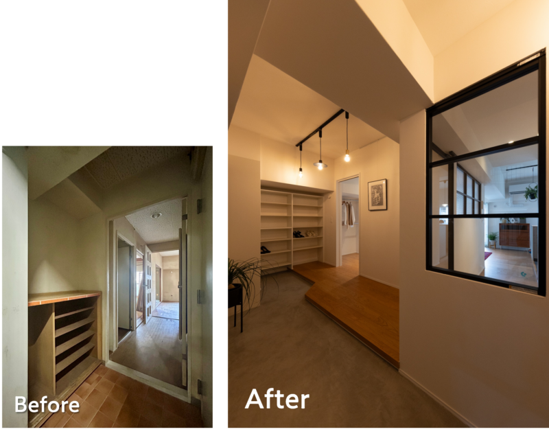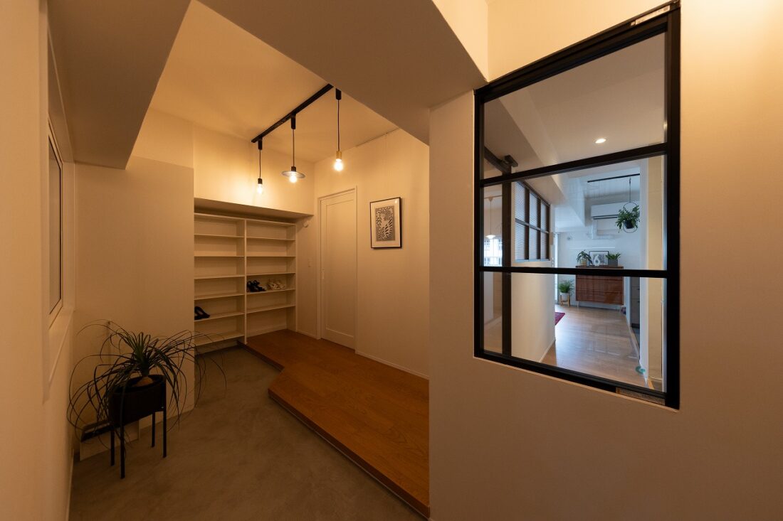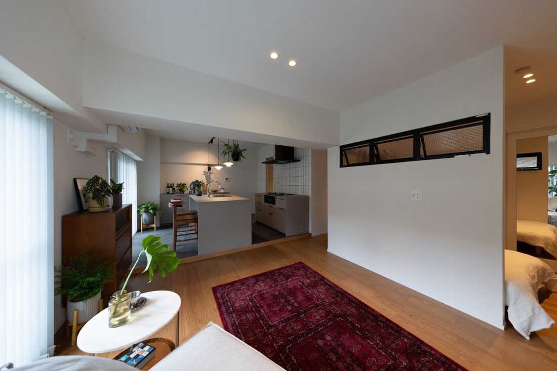 角部屋で窓が2面にあるマンションの一室。 リノベによって窓から差し込む明かりを活かす工夫を取り入れています。 玄関では壁にFIX窓を設置することで、明かりを取り込んでいます。 またリビングドアは大きいガラス入りのデザインとし、寝室には室内窓を取り付け、暗くなりがちな廊下まで明かりが届き全体が明るい印象に。インテリアではベージュカラーをキッチンに取り入れ、北欧ヴィンテージなインテリアとマッチしています。