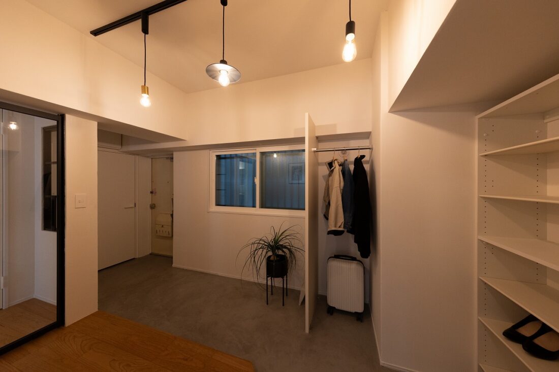 以前は洋室だった場所を贅沢な土間玄関へ。奥行きがあるので、自転車も余裕で置ける広さです。室内に持ち込みたくない物を置けて、アウターを掛けられるパイプハンガーも付いています。土間玄関から寝室へウォークスルーできるのもプランのポイント。照明は遊び心をプラスし、形の異なる電球が並びます。