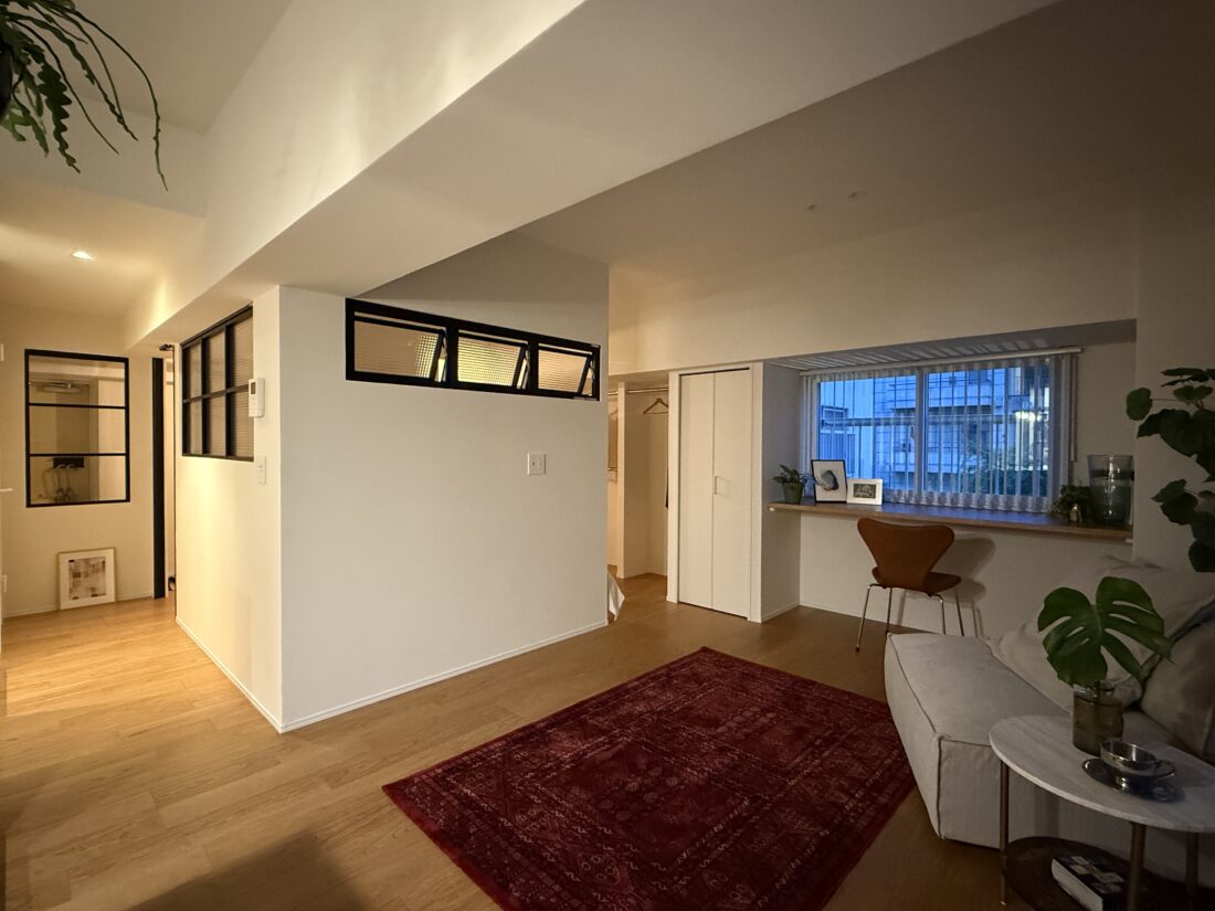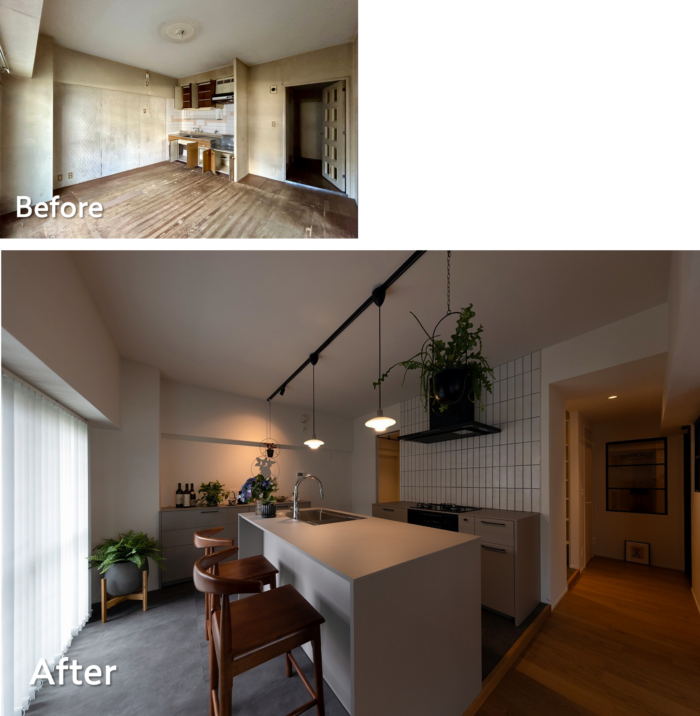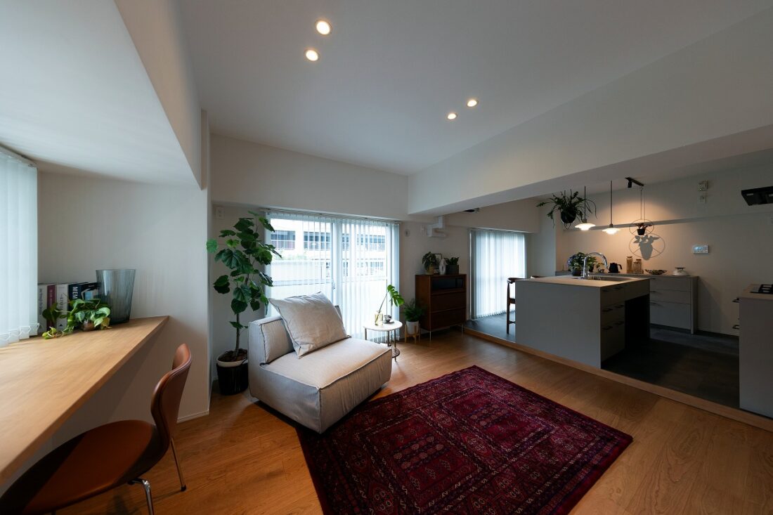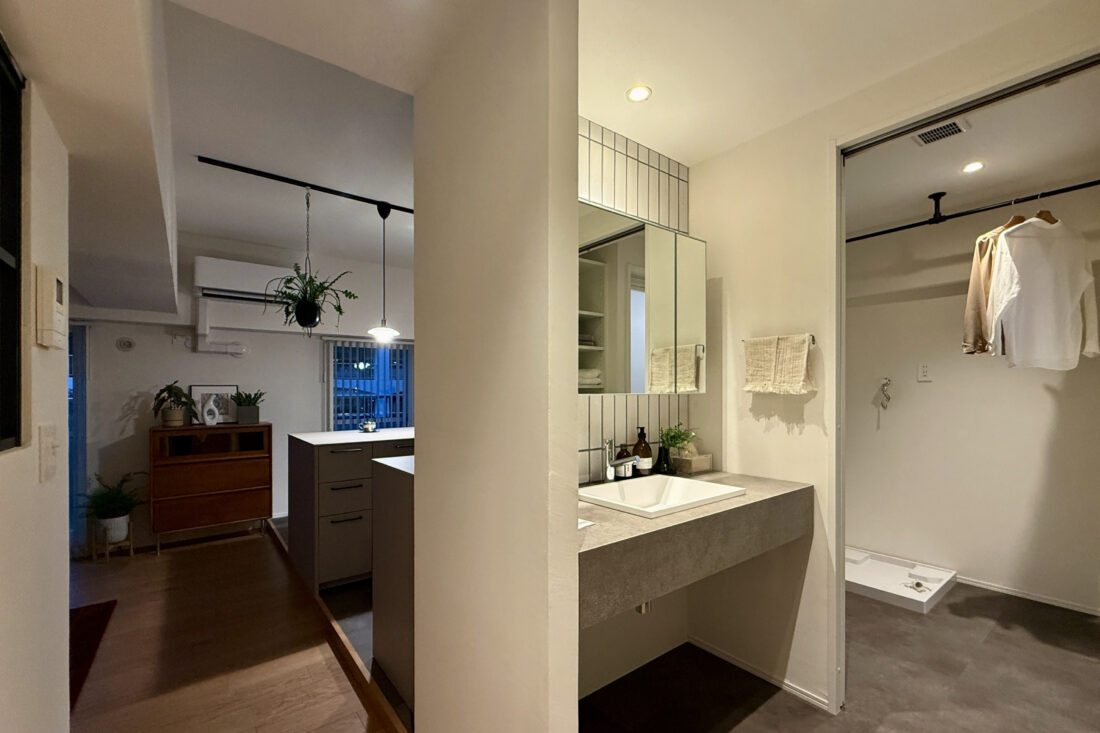 『好きなものだけに囲まれたミニマムな暮らし』をコンセプトに、フルスケルトンにして一度まっさらな状態にし、3DKから0LDKへと大胆に間取りを変更しました。動線や収納・照明・家具など細部にいたるまでこだわった、”暮らし方に合わせた”住まいです。