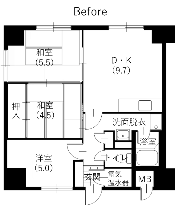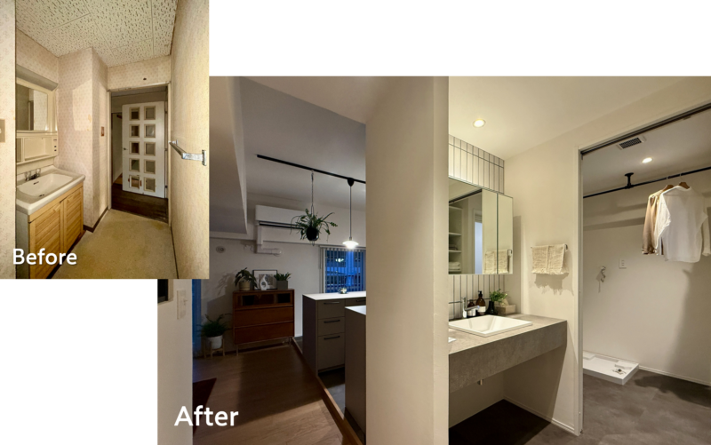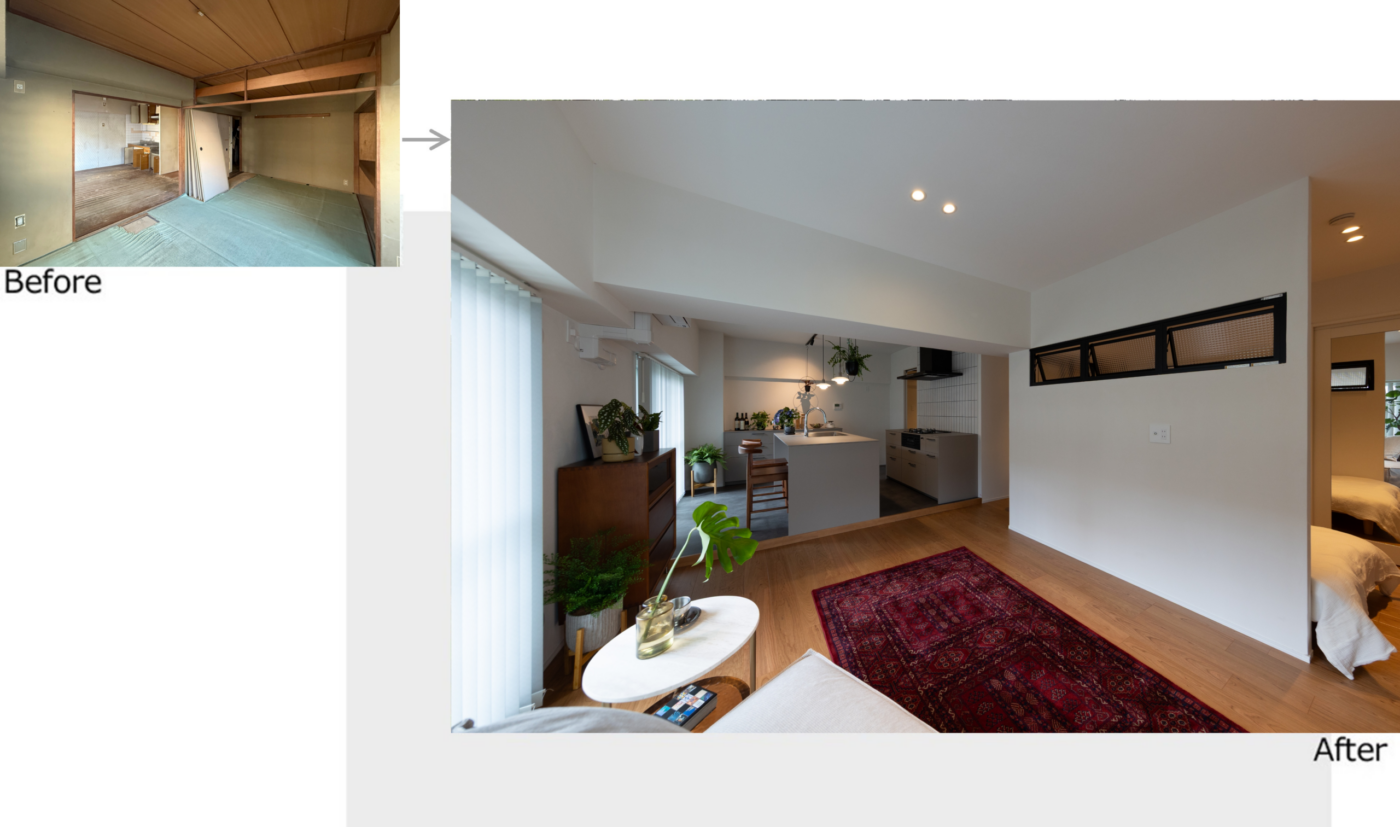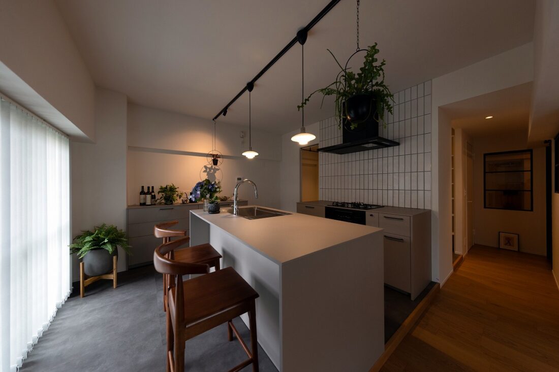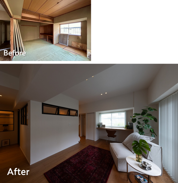 『好きなものだけに囲まれたミニマムな暮らし』をコンセプトに、フルスケルトンにして一度まっさらな状態にし、3DKから0LDKへと大胆に間取りを変更しました。動線や収納・照明・家具など細部にいたるまでこだわった、”暮らし方に合わせた”住まいです。