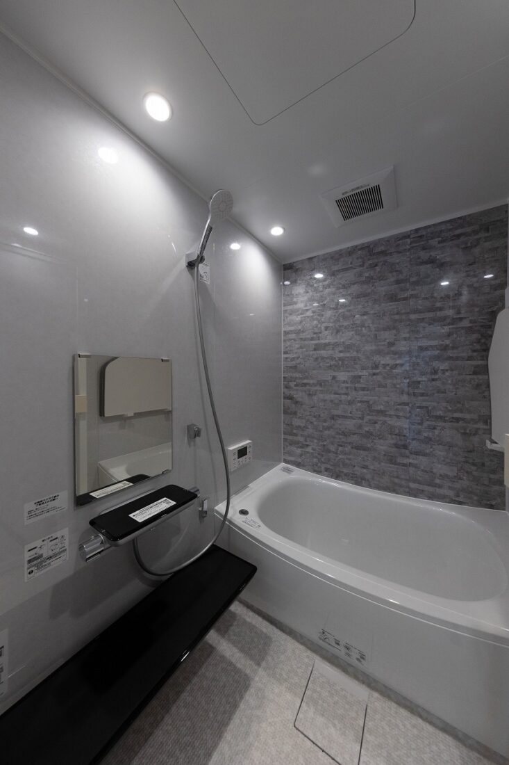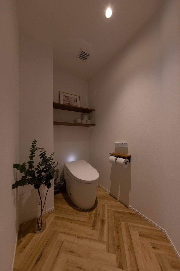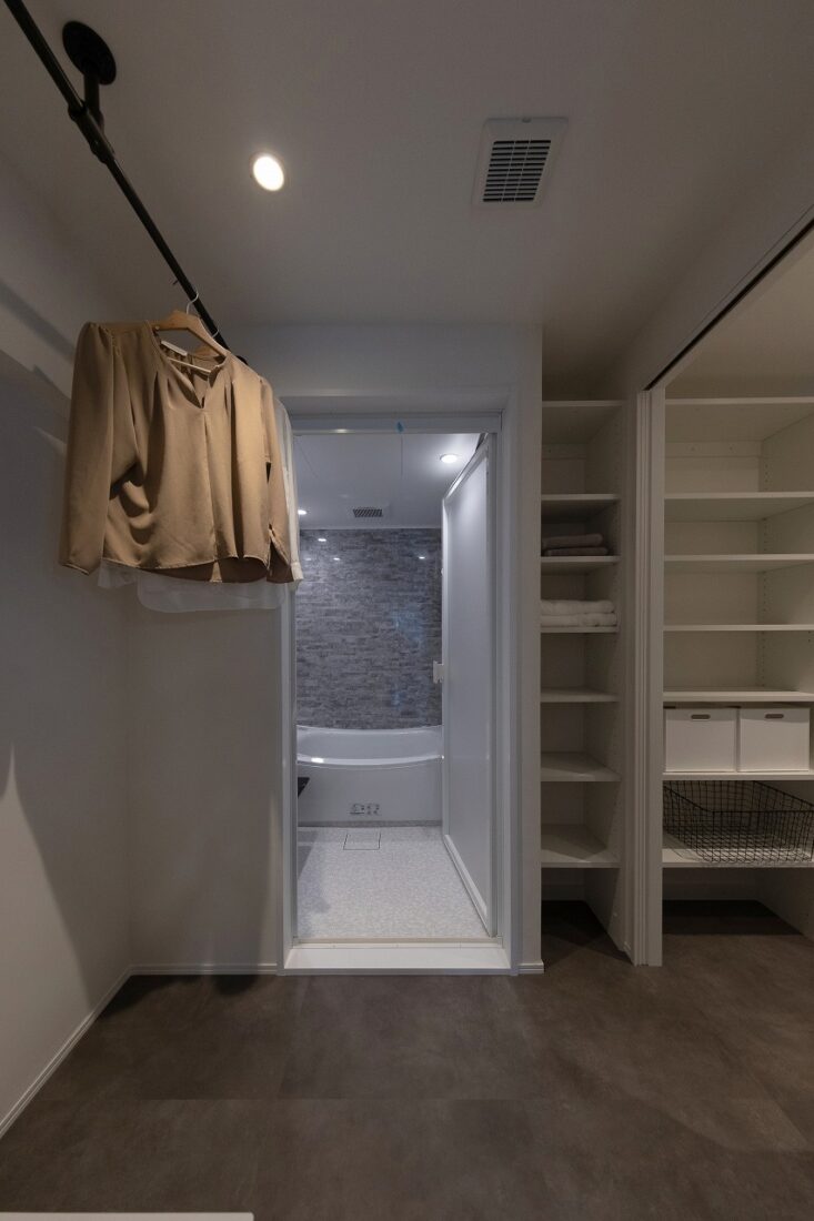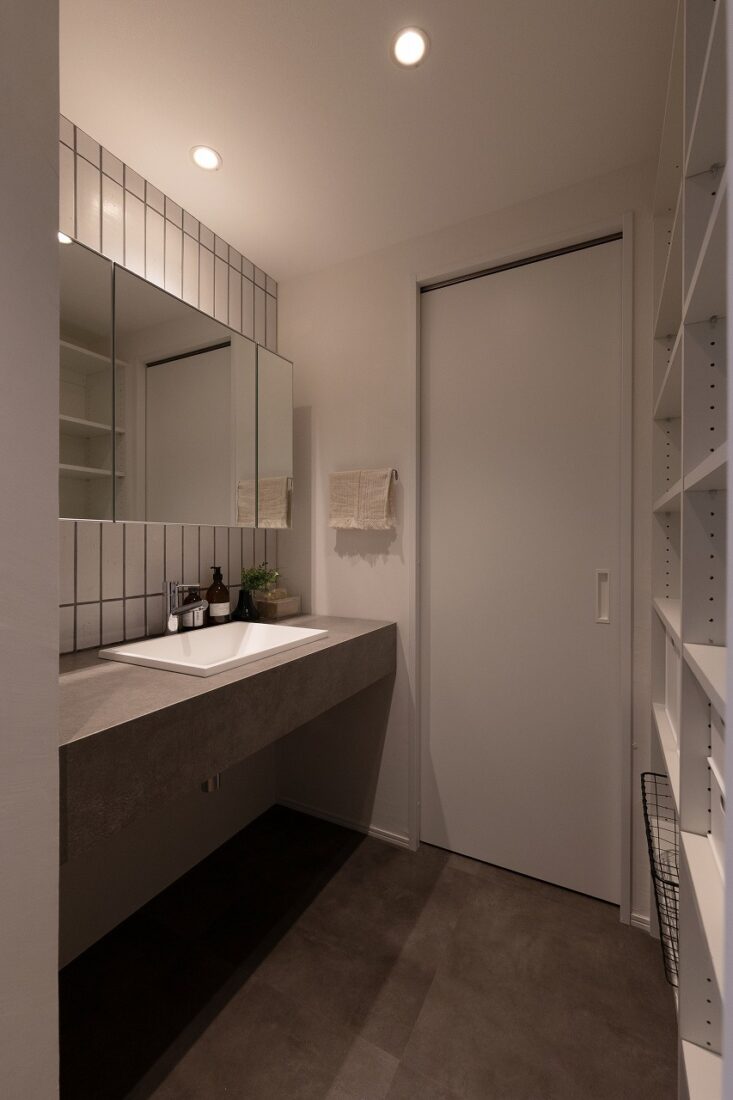 洗面と脱衣を分けたプラン。トイレや帰宅後の手洗い、来客時も気兼ねなく使えます。造作洗面台にはキッチンと同じタイルをあしらってデザイン性アップ。背面は一面収納になっており、タオルや日用品のストックなどが可能です。