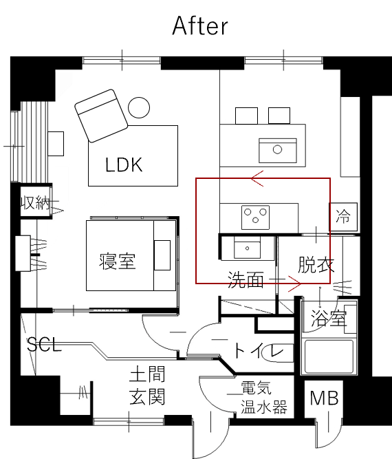 玄関⇆ベッドスペース⇆リビング、キッチン⇆脱衣⇆洗面とまわれる2つの回遊動線。マンションの部屋でありがちな個々に区切られている間取りとは違い、行き止まりがないため空調1台で部屋全体を快適な温度に保てます。Ⅱ型キッチンはダイニングを兼ねており、カップボードを設置して収納量も確保。壁面にあしらったタイルが上質な空間を演出します。