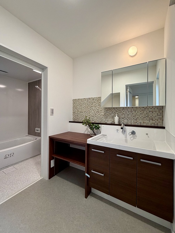 洗面は造作洗面とし、モザイクタイルをアクセントにしました。浴室の扉位置を調整することで、階段下スペースを洗濯機置き場として活用し、家事のしやすさも向上しています。