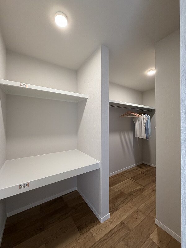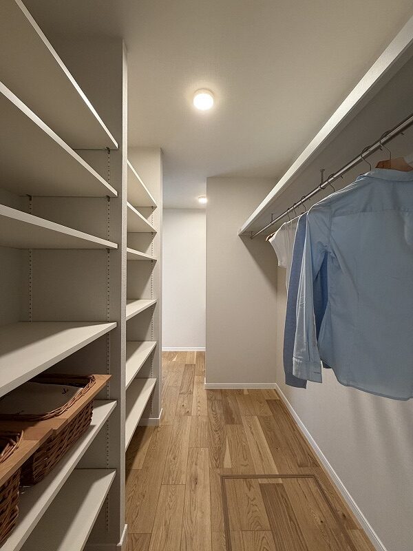 寝室につながるウォークスルー収納は、玄関側とリビング側の2方向からアクセスでき、日常動線をスムーズに。