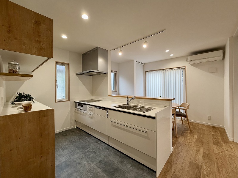 キッチンは壁付けから対面式に変更。リビングとのつながりを感じながら料理ができる配置とし、ニッチを設けてリモコンやスイッチ類もすっきりまとめました。