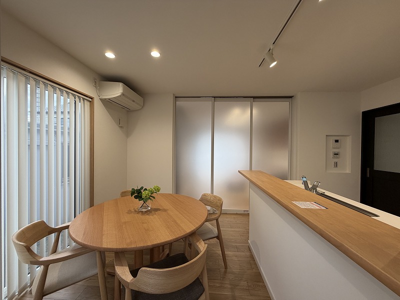 リビングとDKはひとつの空間につなげつつ、ダイニングでひとり時間や仕事ができるよう、スクリーンパーテーションを設置。開ければ開放的なLDKに、閉めれば落ち着いた空間にと、暮らしに合わせて使い分けができます。
