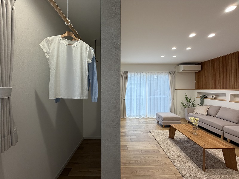耐力壁を設けたリビングのTV背面には、その裏側を活かして物干しスペースと収納を配置。生活感を隠しながら、空間を無駄なく使える工夫です。