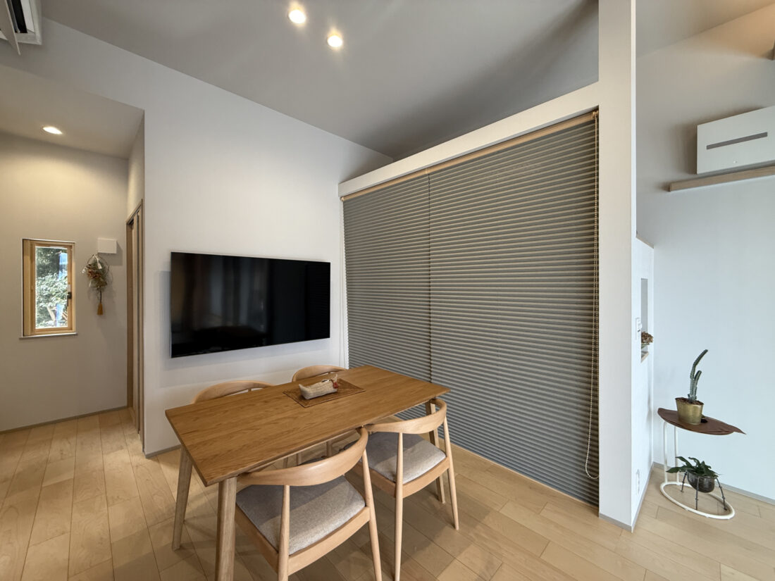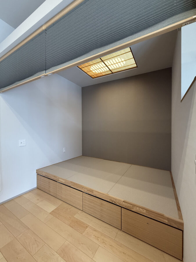 LDKと一体の空間とすることでエアコン1台でも空調効率を確保しました。ロールスクリーンにより、必要に応じて簡易的に仕切ることも可能。小上がり下部は収納として活用し、機能性も高めています。