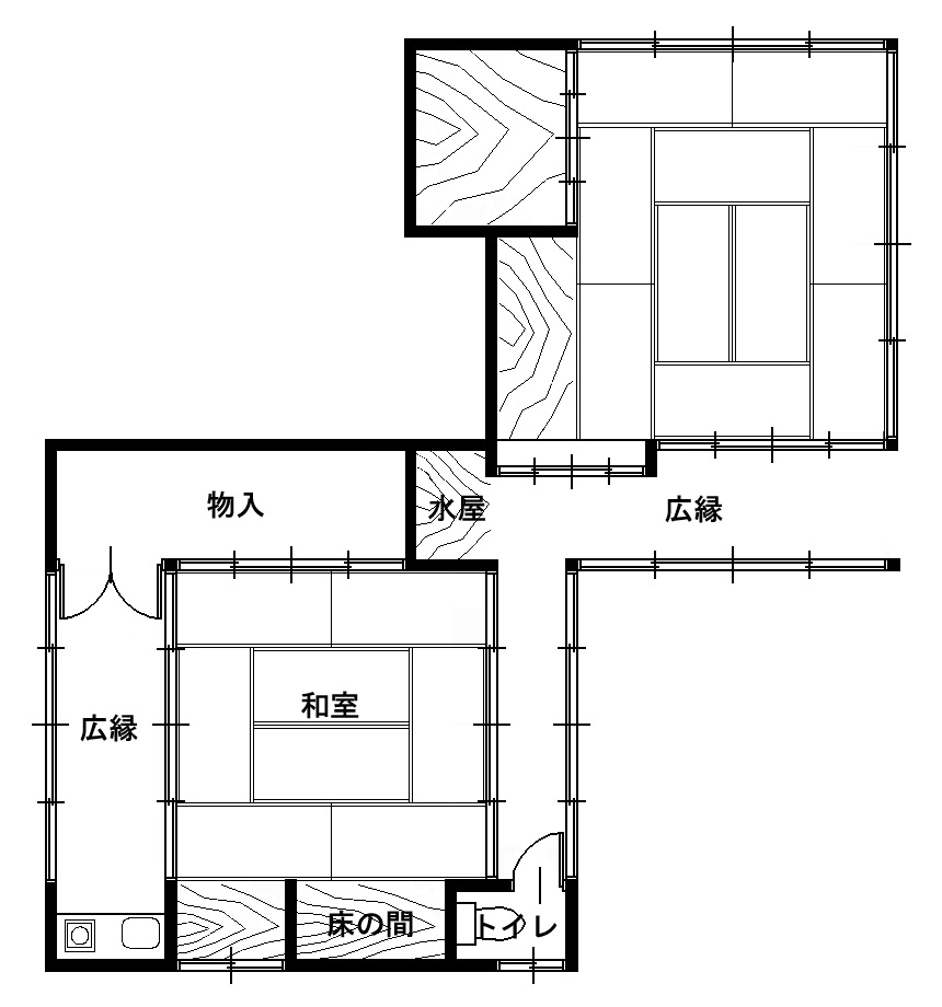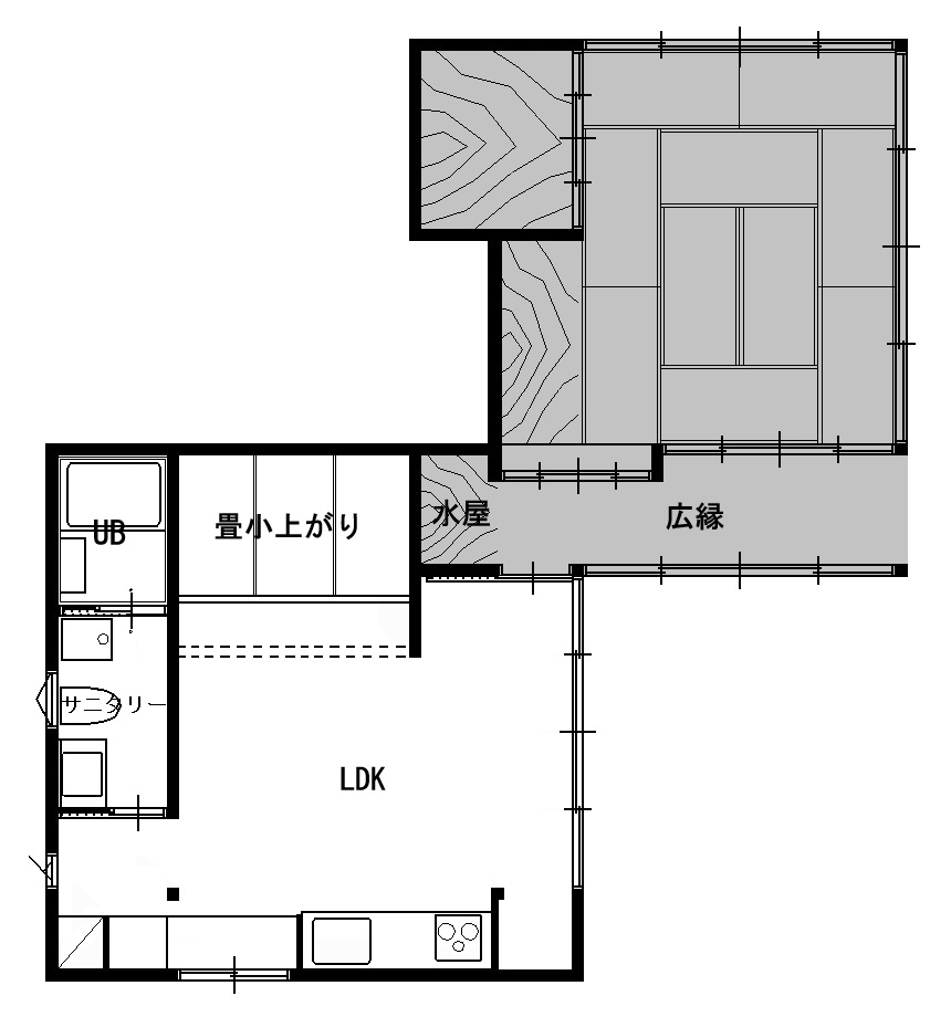 縁側を室内に取り込み、ひと続きのLDK空間へ。既存の大きな掃き出し窓はそのまま活かし、庭を望む心地よい眺めを確保しました。